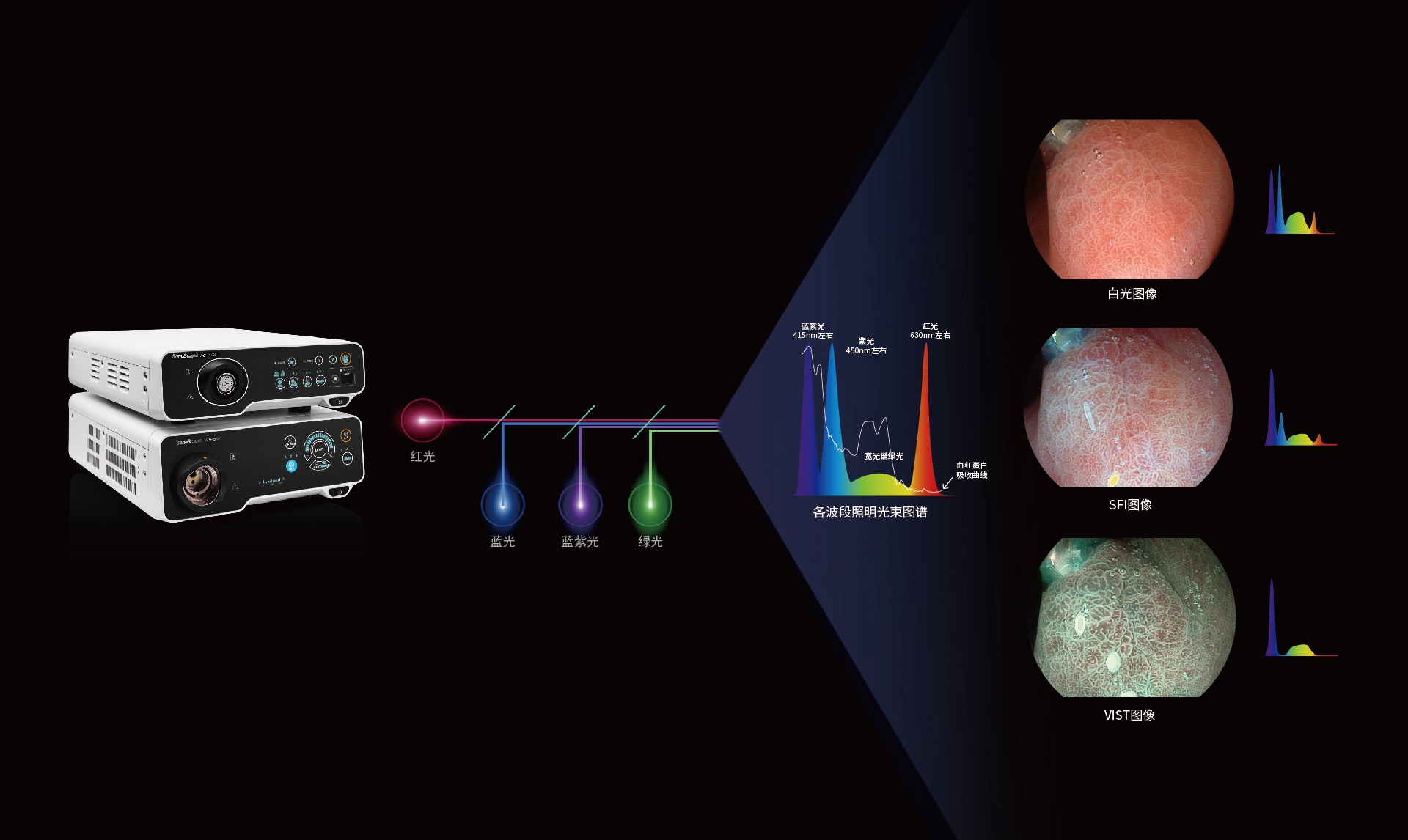 采用光路合束技术,光谱自由度高,实现了更丰富的照明模式,染色模式SFI及VIST,从远景到近景,助力消化道早期疾病诊断。